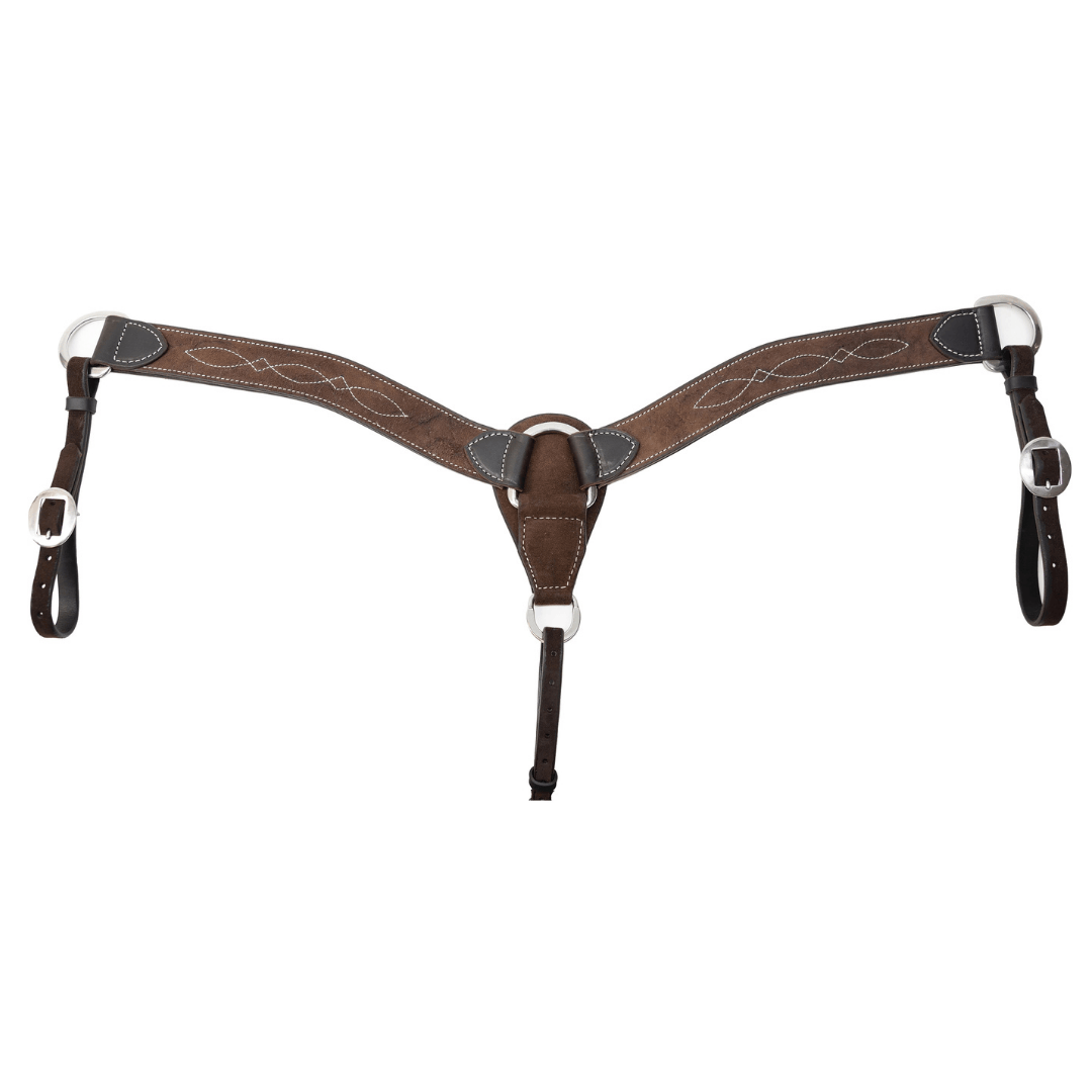 The breast collar is made in a beautiful chocolate roughout finish that gives it an exclusive and rustic western look. The surface of the roughout leather not only adds to its distinctive appearance, but also provides a durable texture that is ideal for riders who want tack with both practical and aesthetic qualities. The handcrafted look is enhanced by the hand-edged and rubbed finish, which creates clean edges and a refined overall appearance with close attention to detail.