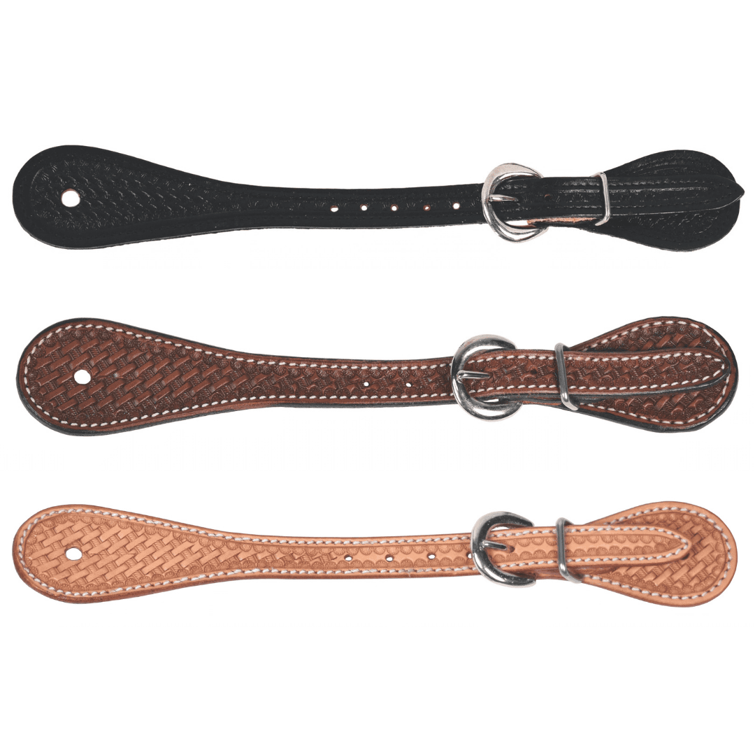 Prof. Choice Sagebrush Basketweave Spur Straps for men with basketweave tooling and nickel plated buckles. Classic western spur straps in Black, Chestnut and Natural.