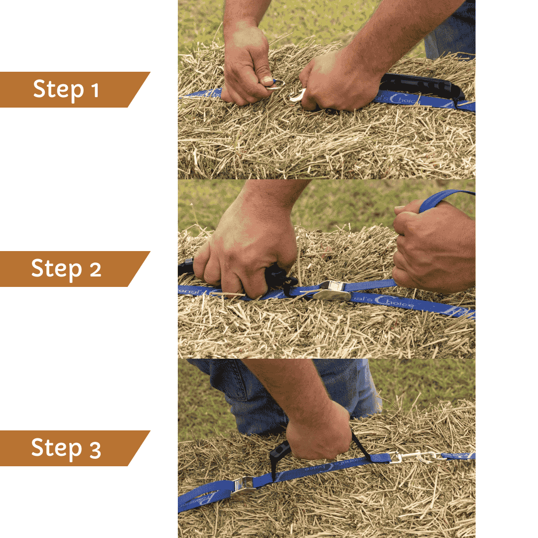 1. You wrap the band around the hay bale and fasten it with the snap hooks.