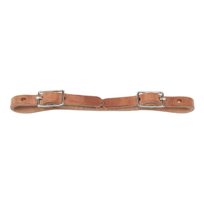 Hermann Oak harness‑leather curb strap. Built so no metal touches the horse. 1/2” nickel‑plated buckles.