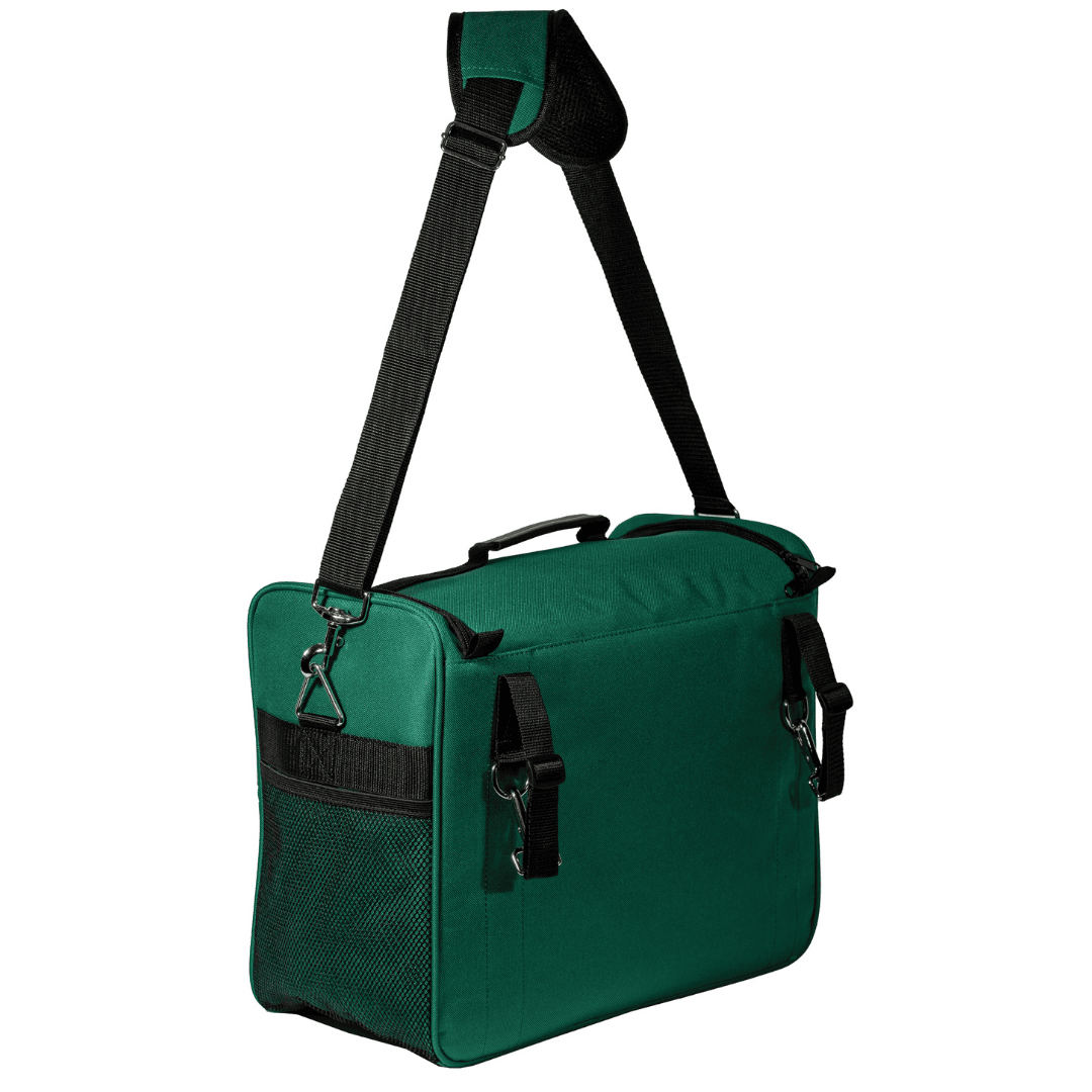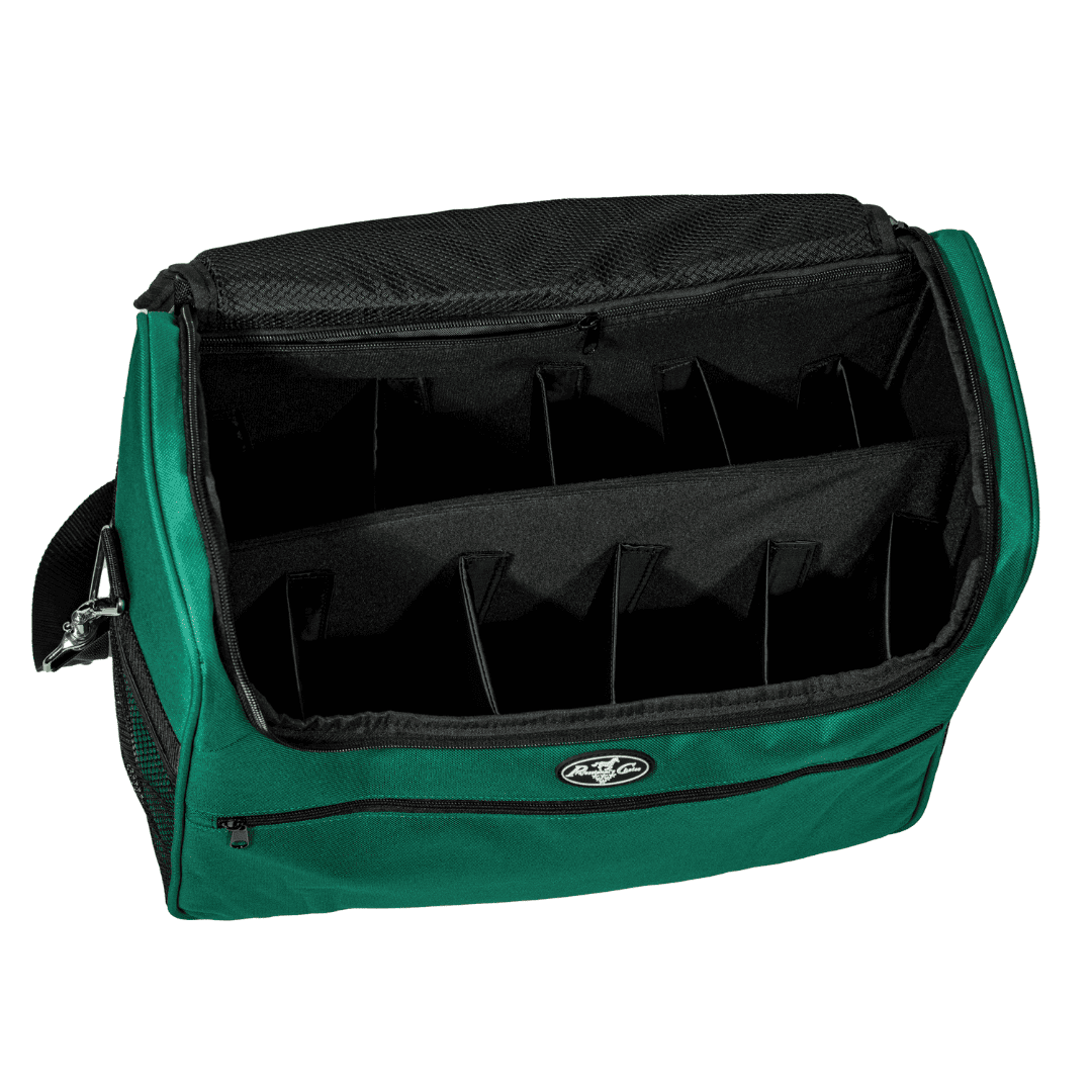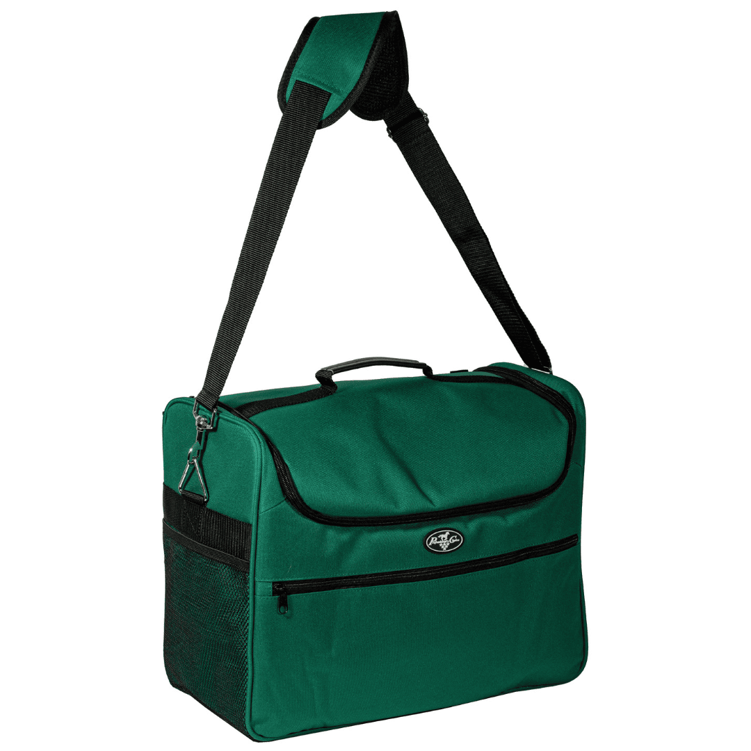 Practical and flexible tack organizer with removable dividers, mesh pockets, and a padded shoulder strap for grooming gear and essentials.