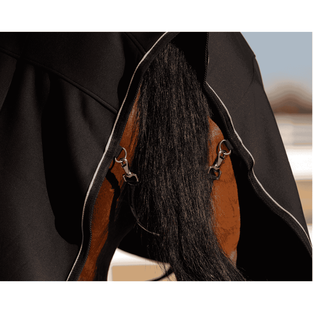 The tail string is covered in plastic, which makes cleaning easier and provides a more practical everyday solution. This type of detail is especially valuable in an active stable environment, where equipment needs to be easy to maintain and quickly ready for use again. Overall, this shows that the blanket has been developed with a focus on both practical needs and comfort for both horse and rider.