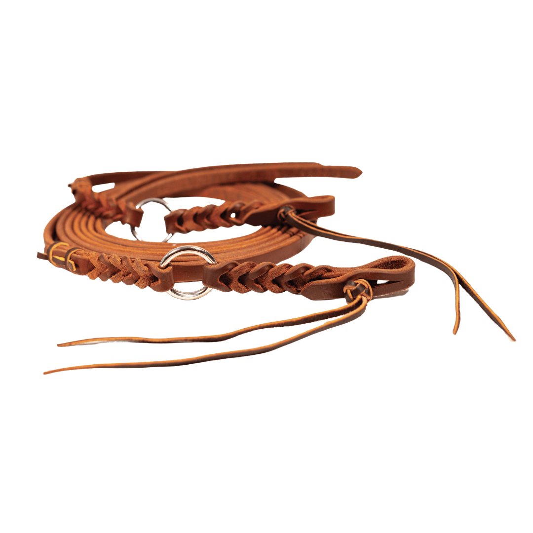 The reins are crafted from oiled harness leather, providing a soft and supple feel in the hand while maintaining strength and durability. The distinctive Bleeding Heart detail at the waterloop and rein ends creates a cohesive and refined design that enhances the classic western look. At the same time, the ring connection ensures clean and consistent movement, improving the rider’s ability to deliver precise cues.