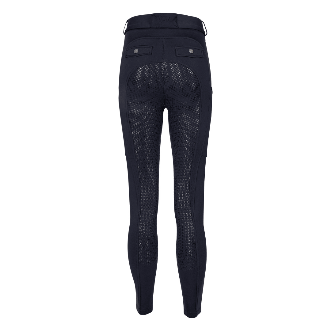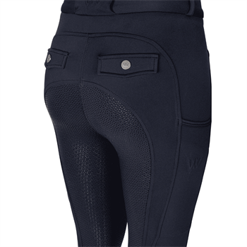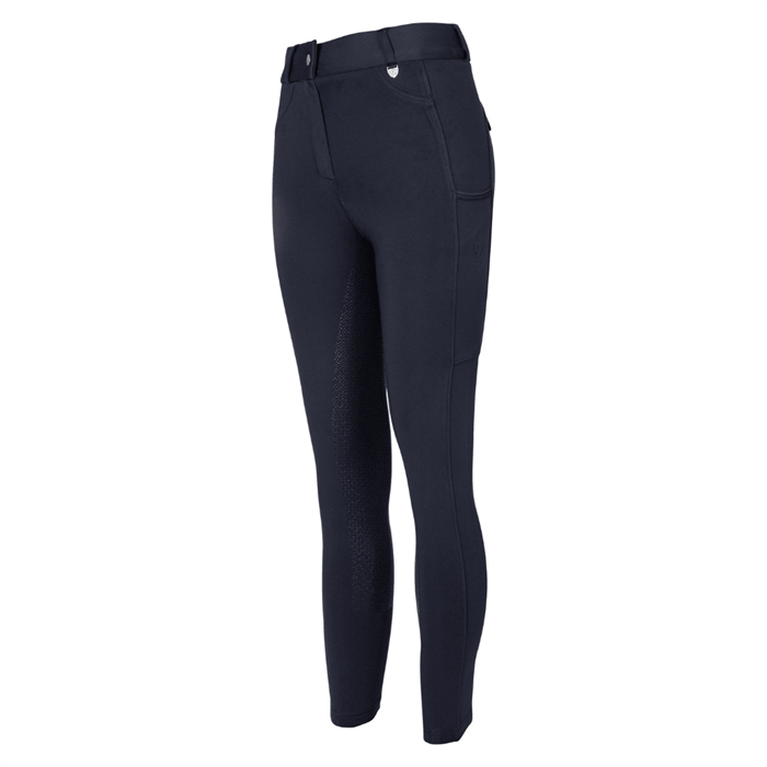 Hybrid riding breeches in Navy with breeches polish and tights comfort: zipped fly, belt loops, faux back pockets, high waistband and Micro-Grip full seat. 4-way stretch.