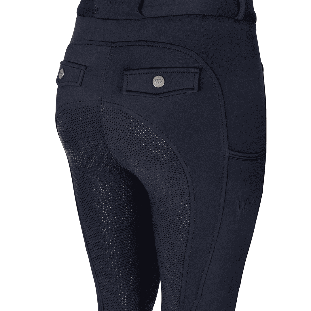 Woof Wear Hybrid II Riding Breeches – Navy combine the classic, smart look of breeches with the elastic comfort of riding tights. You get a versatile everyday pair that looks sharp for lessons and riding—and feels just as good on the yard as in the saddle. The tailored upper with a zipped fly and belt loops gives a clean, professional finish, while faux back pockets balance the silhouette in the saddle. The high waistband supports and flatters so the breeches stay put whether you’re rising to the trot, collecting the canter or working on lateral movements. The deep Navy shade is timeless and easy to style.