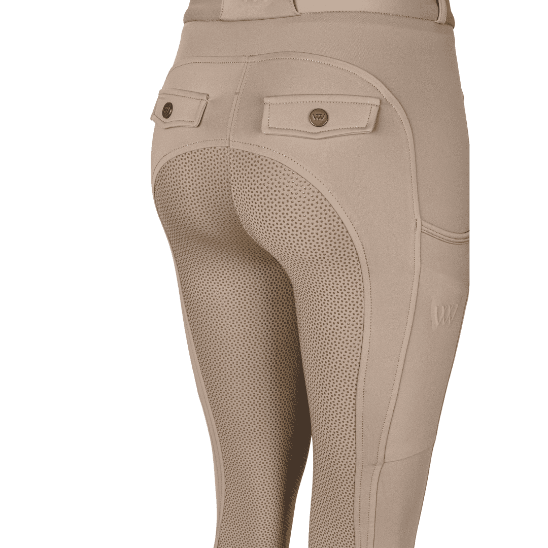 Woof Wear Hybrid II Riding Breeches – Stone combine the classic, smart look of breeches with the elastic comfort of riding tights. You get a versatile everyday pair that looks sharp for lessons and riding—and feels just as good on the yard as in the saddle. The tailored upper with a zipped fly and belt loops gives a clean, professional finish, while faux back pockets balance the silhouette in the saddle. The high waistband supports and flatters so the breeches stay put whether you’re rising to the trot, collecting the canter or working on lateral movements. The bright Stone shade is timeless and easy to style.