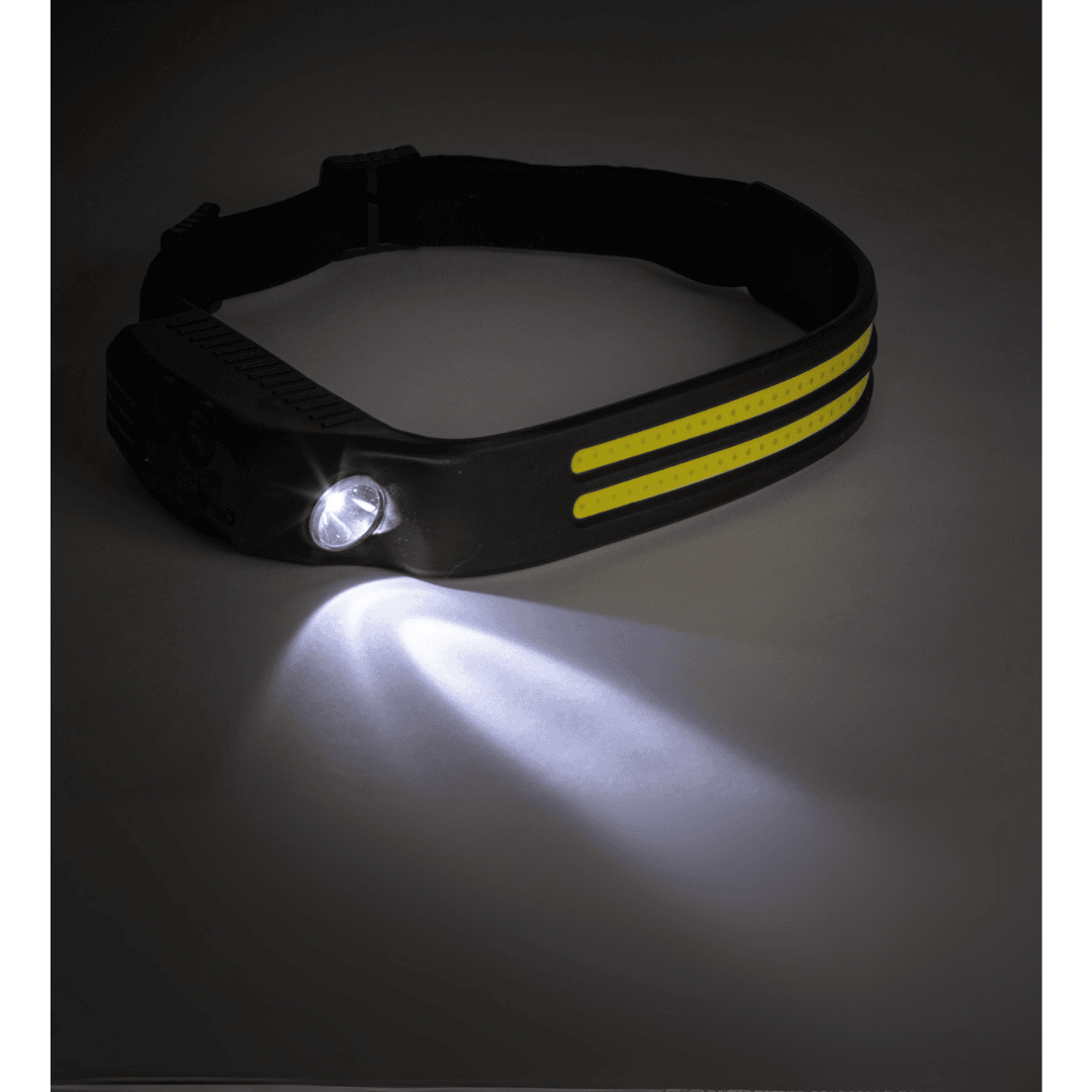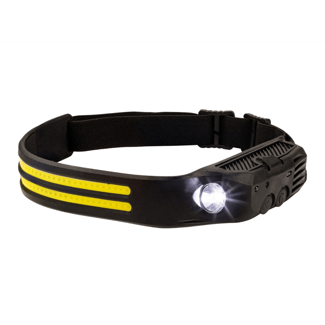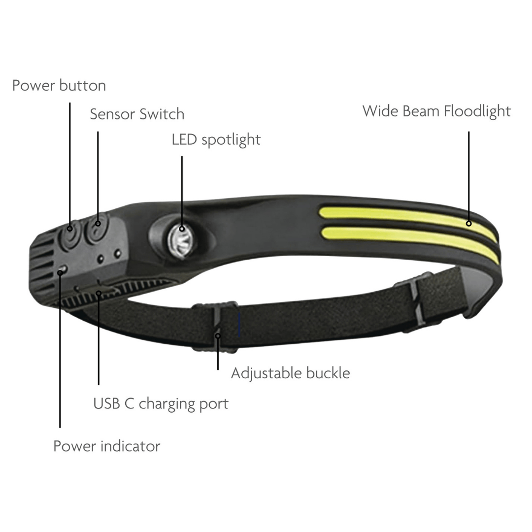 Lightweight rechargeable LED head torch with motion sensor, spotlight and wide beam. Ideal for stables, dog walks, camping and hands-free work.
