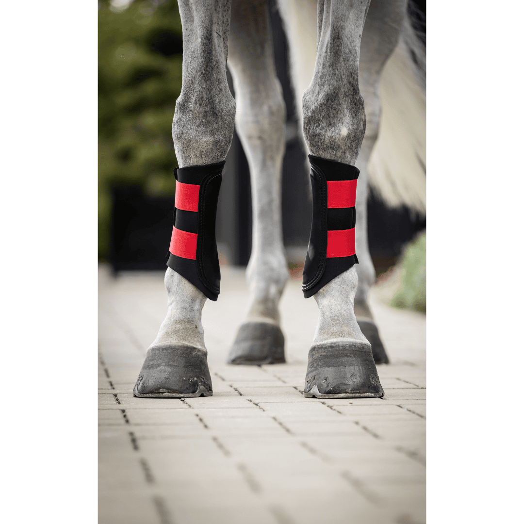 Updated Royal Red brushing boot with reinforced PU/vinyl strike pad, 7 mm neoprene and Secure‑Grip closure. Breathable, low water retention, for front or hind legs.