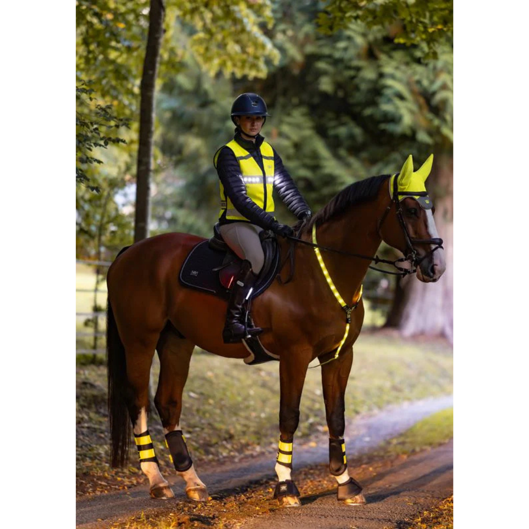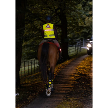 Hi‑vis riding vest with white front LEDs, red rear LEDs, reflectives and water‑resistant fabric. 3 modes. Lightweight, adjustable.