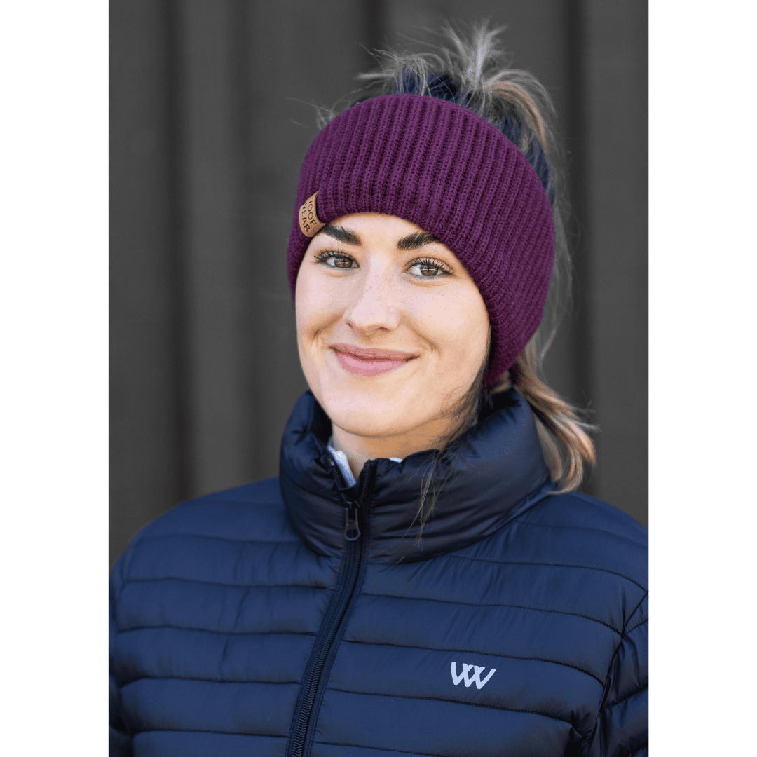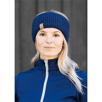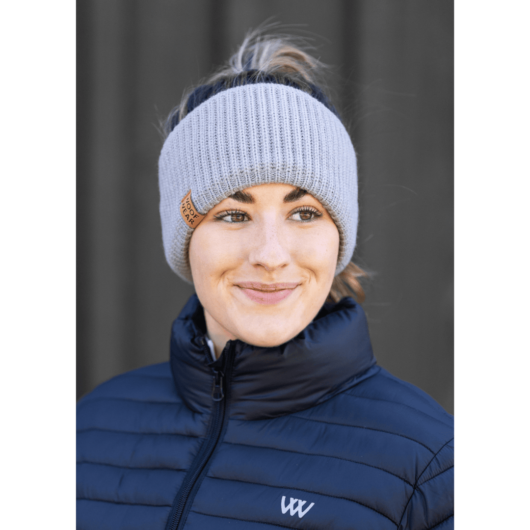 Woof Wear headband with soft fleece lining and faux‑leather WW badge. Keeps ears and forehead warm. Available in Stone, Navy and Plum—light, breathable and stylish.